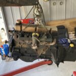 Ford F1のエンジンをクレーンで吊って、エンジンスタンドにかける。