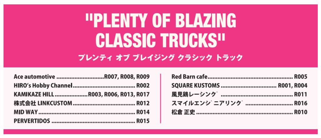 出展するコーナーは”PLENTY OF BLAZING CLASSIC TRUCKS”となります。